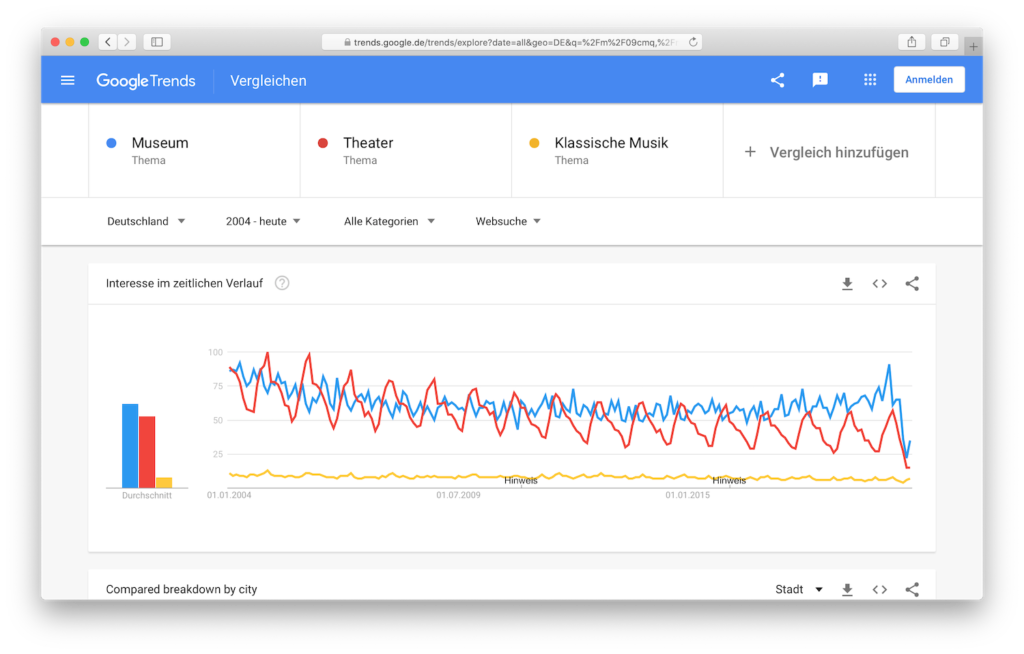 Google Trends ist ein Tool, das die Suchanfragen, die in die Suchmaschine Google eingegeben werden zeitlich untersucht. Dabei werden verschiedene Suchanfragen zu »Themen« zusammengefasst, um z.B. Suchen nach »Theater in meiner Nähe« und »Berlin Theater« dem Thema Theater zuzuordnen. Außerdem lassen sich mehrere Themen miteinander vergleichen, um zu erkennen, welches Thema häufiger nachgefragt wird.