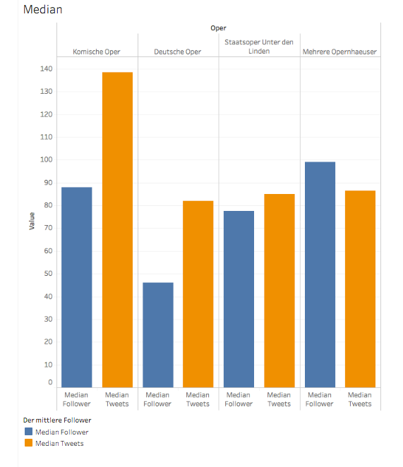 Um aus dieser Masse an Daten nun eine Übersicht über die Relevanz der Follower zu erhalten, wurde der Median der Follower als auch der Median der Tweets pro Opernhaus betrachtet. Es wurde dabei der Median statt dem arithmetischen Mittel verwendet, um den Einfluss der Ausreißer einzuschrenken.